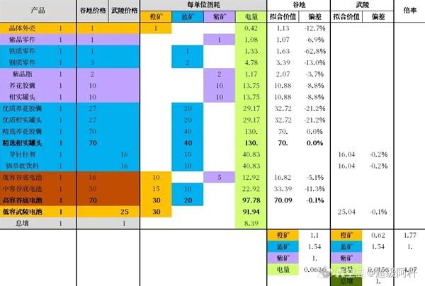 下表上价值表格,通过拟合运算出的矿产价值,分别对应谷地和武陵的代币量。例如蓝矿在谷地和武陵都可以对应1.54代币,但谷地的调度券和武陵的调度券实际价值也不是1:1,我是按两边的刻写券来算的汇率(定量商品换完就完了,并不方便定义两边价值)所以粗略个人用刻写券的价格对比价值,及1的武陵券值3.33的谷地券,而且考虑到武陵是后续的内容,其调度券的用途只可能更多,所以1:3.33只是保守的计算。
