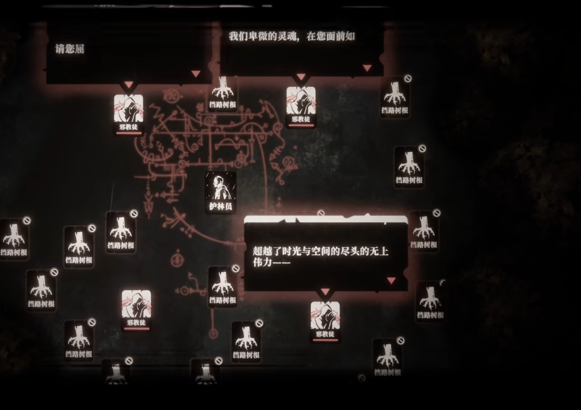 游戏中两大核心资源为“血液”与“水分”。血液主要来源于与非NPC角色(如异兽、畸变体等)建立连接并完成献祭,是解锁新卡牌、提升能力等级的核心物资;水分则仅能通过探索地图中分布的泉眼获取,属于不可再生型战略资源。尤其在第三章与第四章阶段,水分消耗量显著上升,因此前期合理规划采集节奏尤为关键。在收集过程中,还会逐步触发多位NPC的命运支线,形成多线交织的角色关系网。