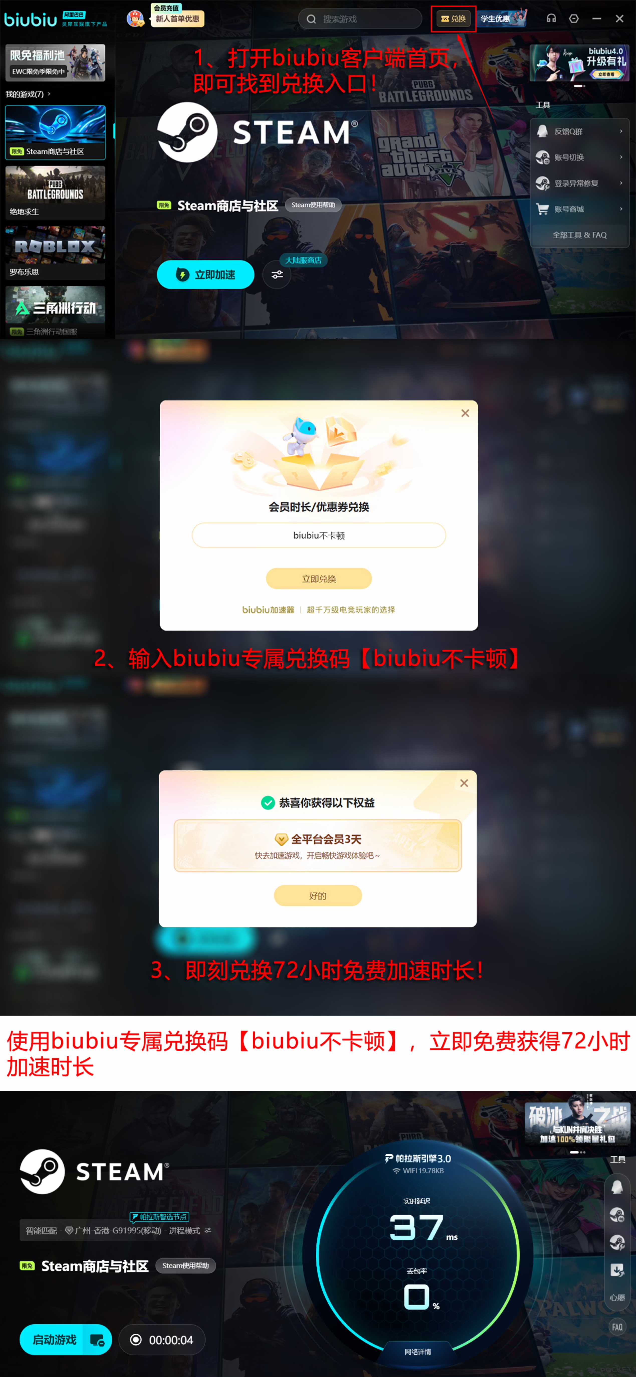 新用户首次注册并完成登录后,即可免费获得24小时全节点加速权限;所有用户均可凭口令“biubiu不卡顿”领取3天通用加速时长,无需绑定设备或额外条件限制。