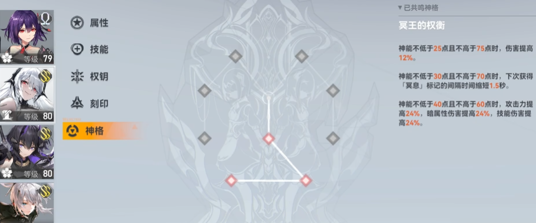 神格路线的选择直接决定了哈迪斯的操作难度与团队定位,玩家需根据自身操作习惯进行取舍。对于追求极限输出的手动操作玩家,冥王的权衡(中线)是最优选择,该路线要求将神能精确控制在40至60的区间内,以此换取攻击力、暗属性伤害与技能伤害的大幅提升,并缩短冥息标记的获取间隔,是典型的以高操作换取高回报的路线。若计划将哈迪斯交由AI操控或希望其承担辅助职能,冥王的愚弄(右线)更为合适,该路线会定期自动切换人偶,并为敌人附加减少暗属性抗性与防御力的负面效果,使其成为一名优秀的暗属性辅助角色。至于冥王的界限(左线),其机制改为在神能满值或空值时获取标记,虽然降低了控能要求,但整体收益通常不及中线,故不作首要推荐。