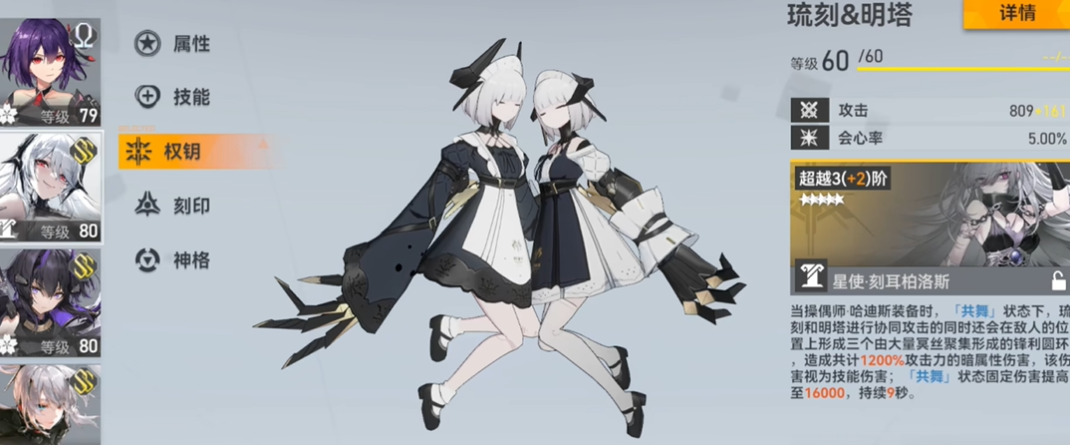 哈迪斯的核心输出围绕操纵琉刻与明塔两名人偶展开,普通攻击为交替攻击,其中操纵琉刻时命中敌人会消耗神能,操纵明塔时则会获得神能。其核心机制冥息标记的获取与神能值紧密相关,当神能处于特定区间时,会定期获得冥息标记,每个标记都能提升会心率与会心伤害。一技能冥丝轮转用于切换当前操纵的人偶,并在下次释放二或三技能时触发伴舞状态,改变技能形态。集满四个冥息标记后,可通过长按普通攻击进入高爆发的共舞状态,此状态下会心率、会心伤害与固定伤害均获得提升,但无法使用技能且无法继续获取标记。奥义技能则能在持续时间内周期性将神能重置为50点,并为全队提供基于冥息标记数量的暴击增益。