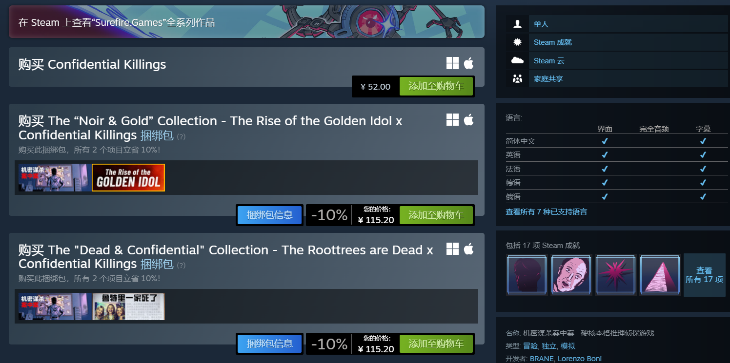 《机密谋杀案中案》Steam国区标准售价为52元。首发期曾推出限时特惠价46.8元,目前该活动已结束。但根据Steam历年运营节奏,推理类专题促销(如“推理节”)通常会带来至少10%的折扣;此外,游戏支持与其他同类型推理作品打包购买,可进一步降低单款成本,具体折扣幅度以实际页面展示为准。