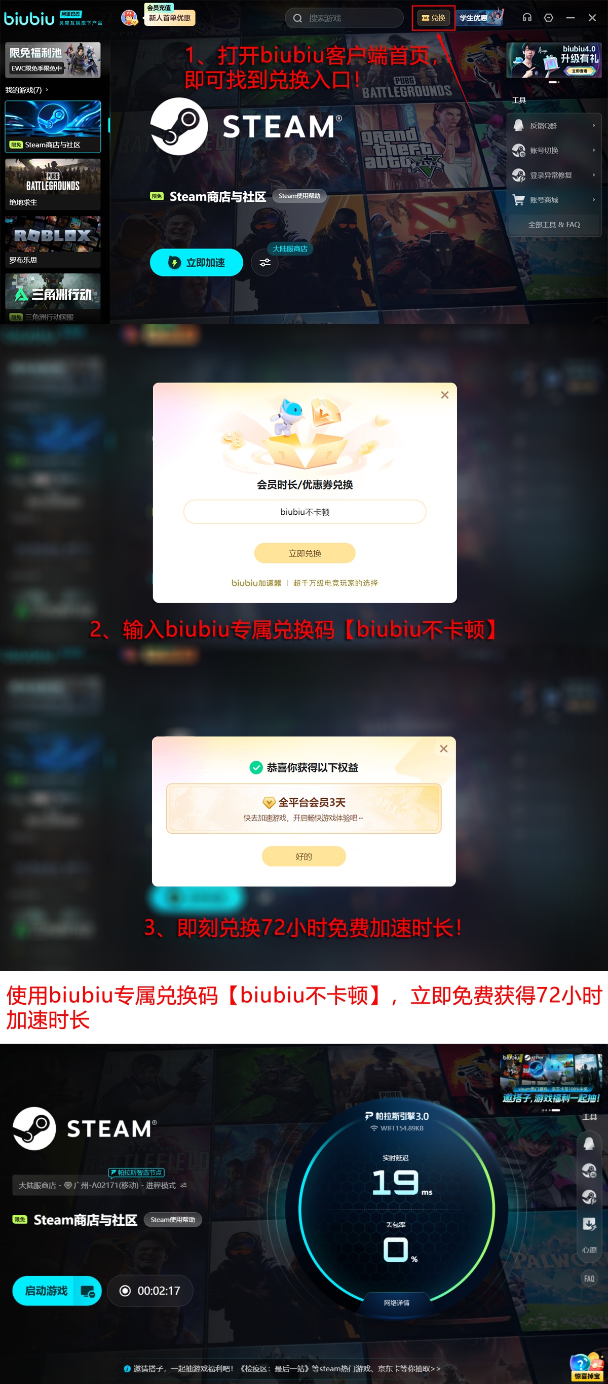 该工具已通过职业电竞训练场景验证,成为PeRo战队日常训练及高强度对抗赛指定使用的网络加速方案。新用户完成首次注册后,系统将自动发放24小时全功能免费试用权限;所有用户输入口令【biubiu不卡顿】,还可额外激活3天跨平台通用加速服务。