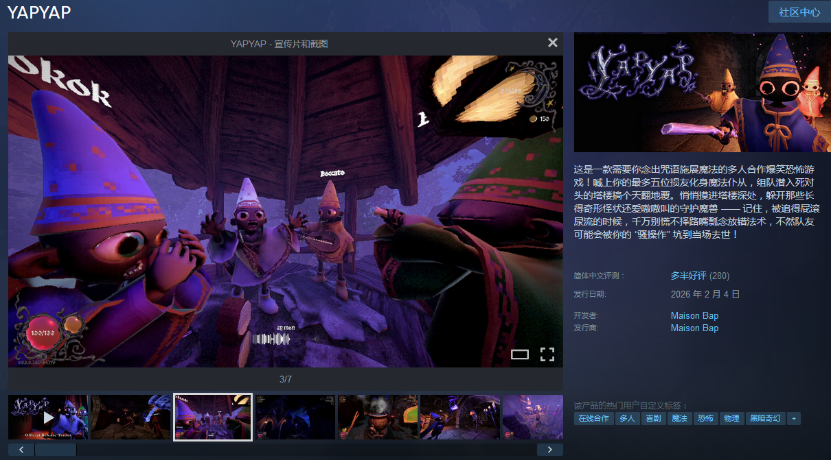 综上所述,YAPYAP已在2026年2月4日于Steam平台正式发售,定价35元。其语音施法机制、程序化高塔地图、双语咒语识别、强社交互动能,共同构建出独一无二的欢乐恐怖体验。感兴趣的朋友可即刻前往Steam商店页面了解详情并完成购买。