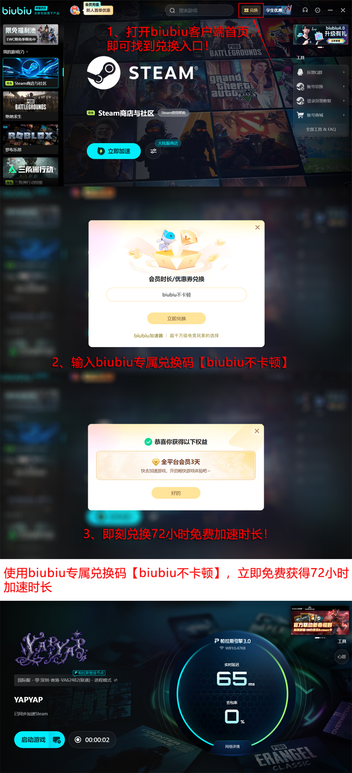 新用户注册后可免费获得24小时加速时长;另附通用兑换码【biubiu不卡顿】,每位账号限用一次,可兑换72小时服务。两项权益叠加,相当于新用户实得96小时免费加速体验。