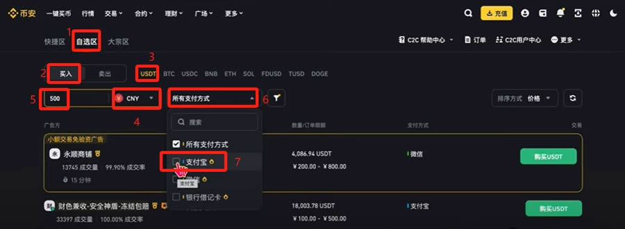 登录后点击"一键买币"进入自选区,选择USDT作为基础币种。该稳定币与美元1:1挂钩,是购买其他数字货币的媒介。