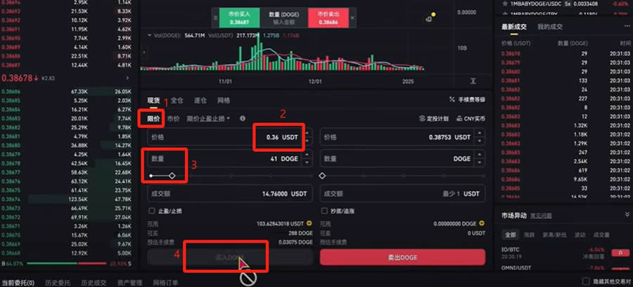 通过"资金账户→现货账户"划转USDT后,即可在交易界面搜索DOGE等币种进行兑换。