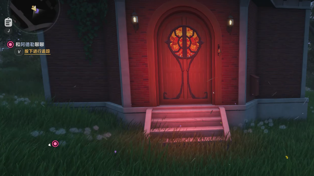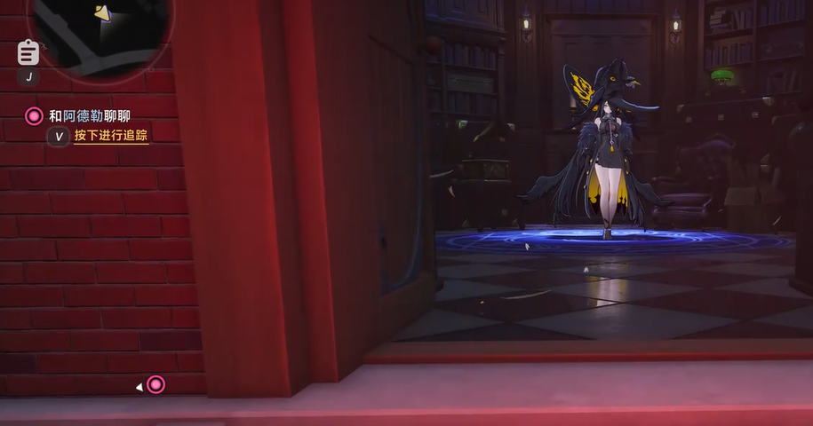 目的地为一栋外观鲜明的红色独栋房屋,建筑风格融合哥特元素与童话意象,视觉特征突出。靠近正门后,按互动键轻敲门扉,随即触发专属过场动画:画面首帧呈现一顶悬浮的黑色宽檐帽,随后身着暗色长袍、佩戴银饰的魔女黑羽现身,正式开启场景交互流程。
