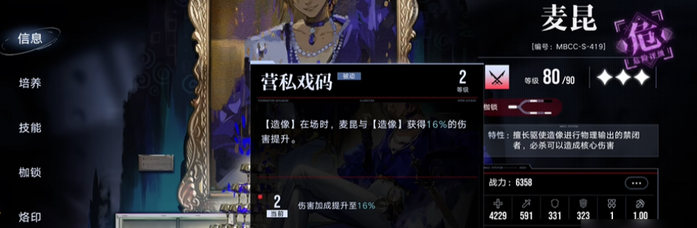 第二条路线是普攻流,其侧重点在于麦昆本体与造像的持续协同作战能力。该玩法不追求一次性引爆,而是让造像长期驻场,利用被动技能摹拓技巧使麦昆的普通攻击附加额外伤害,同时造像本身也能进行攻击和阻挡敌人。技能加点方向以普攻裁切、被动摹拓技巧和营私戏码为主,即技能1、3、4。普攻流对专属烙印的依赖度相对较低,开启优先级不高,但满级后仍有收益。在烙印选择上更为灵活,除了可搭配造物强化召唤物,也会考虑提升麦昆自身输出或生存能力的套装。