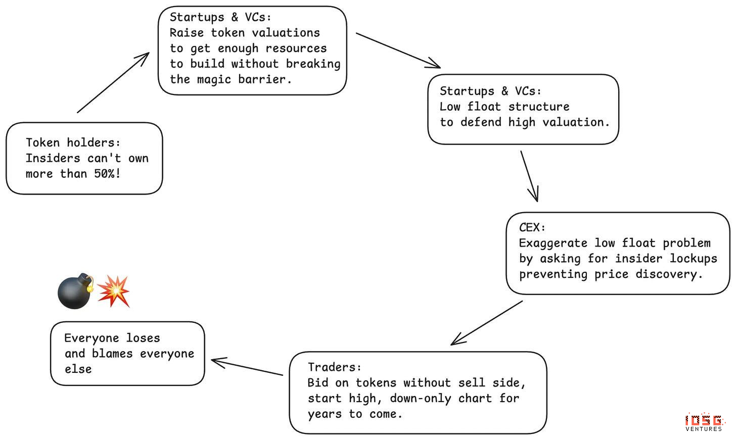尤其狡猾的是,低流通造成了一种人人以为自己在赢、实则人人皆输的局面:#中心化交易所以为通过要求更低流通和更多控制来保护散户。结果却是面对愤怒的社区和糟糕的价格表现。#代币持有者以为保持低流通能防止内部人士抛售。结果是从未实现真正的价格发现,作为早期支持者反而受到惩罚。当他们要求内部人士持仓不得超过50%时,反而将一级市场估值推高到不合理水平,迫使内部人士用--没错--低流通策略来维护这些估值。#项目团队以为低流通操纵能让他们合理化高估值和最小稀释。但总体而言,如果这一趋势持续,这种做法将摧毁整个行业的融资渠道。#VC机构以为可以按低流通代币仓位进行按市值计价,从而募集更多资金。结果是随着策略缺陷日益明显,中长期内反而失去融资渠道。