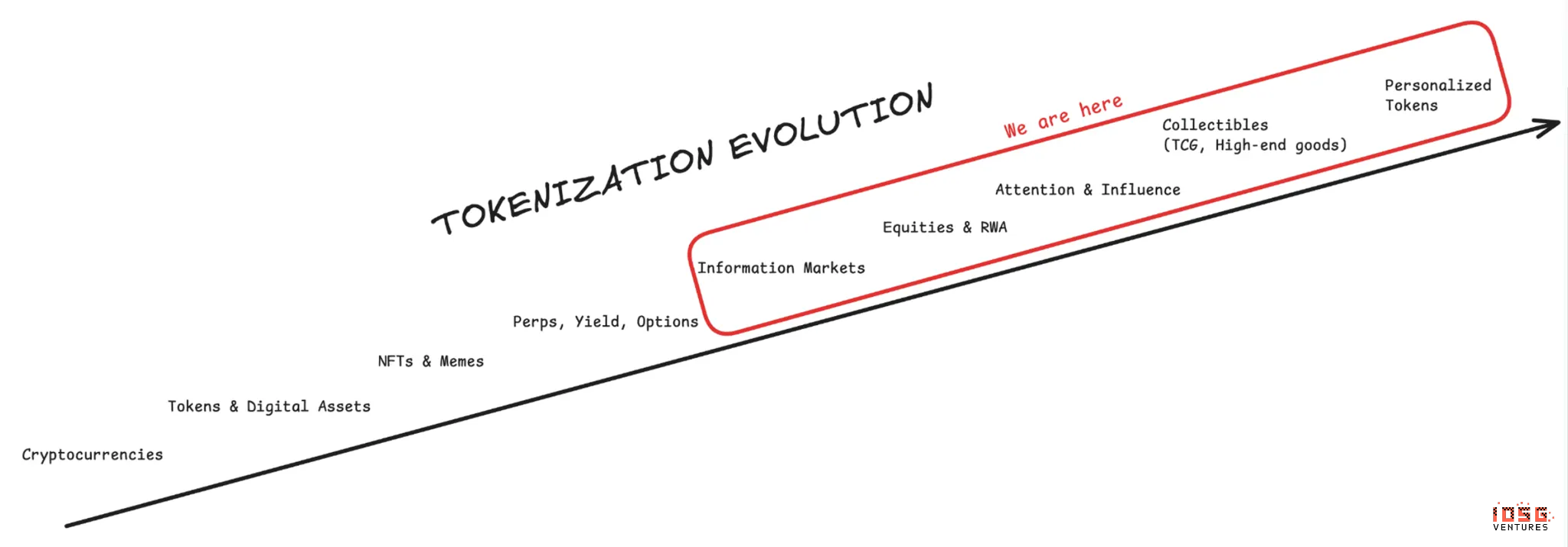 互联网资本市场:代币化的终局:区块链技术实现了单一的、可编程的全球账本,资本全天候流动,代币化使任何资产都能被识别、交易并即时跨境结算。代币化的演进经历了不同的元周期:从最初的加密货币,到代币(如山寨币和数字资产),再到NFT和Meme币,接着是信息市场(预测市场),以及目前涵盖股票、RWA以及广泛的经济衍生品。展望未来,前沿领域包括收藏品(如集换式卡牌游戏和高端商品)、注意力和影响力市场,最终是个人化代币。随着每个新元叙事出现,专业化交易基础设施随之跟进。加密交易格局已从基础的比特币交易所(Binance、OKX、Coinbase、火币)演进至链上DEX(Uniswap)和聚合器(1inch、0x),再到NFT市场(OpenSea)和终端(Blur),Meme代币发射台(Pump.fun)和终端(Axiom、GMGN、FOMO),PerpDEX(Hyperliquid、Lighter)及其新兴终端和聚合器,以及预测市场平台(Polymarket、Kalshi)及其自身的新兴终端基础设施。每个元叙事都需要专门为追求简洁的散户用户和需要高级功能的专业用户量身定制的界面。当前这一代(聚焦永续合约和预测市场)产品,随着市场成熟并与传统经济整合,呈现出重要的风投机会。