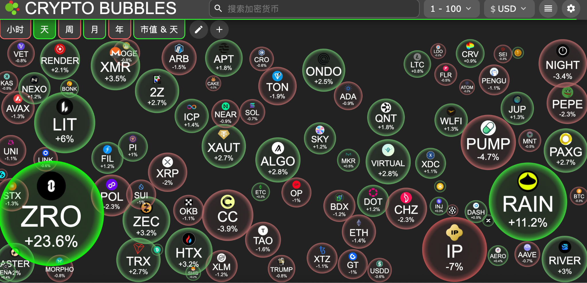 今日市值前100币种最大涨幅:LayerZero涨23.6%、Rain涨11.2%、Lighter涨5.8%、River涨4.1%、Monero涨4%。
