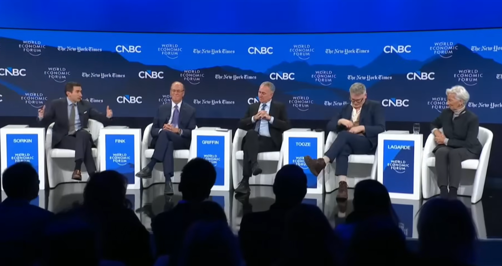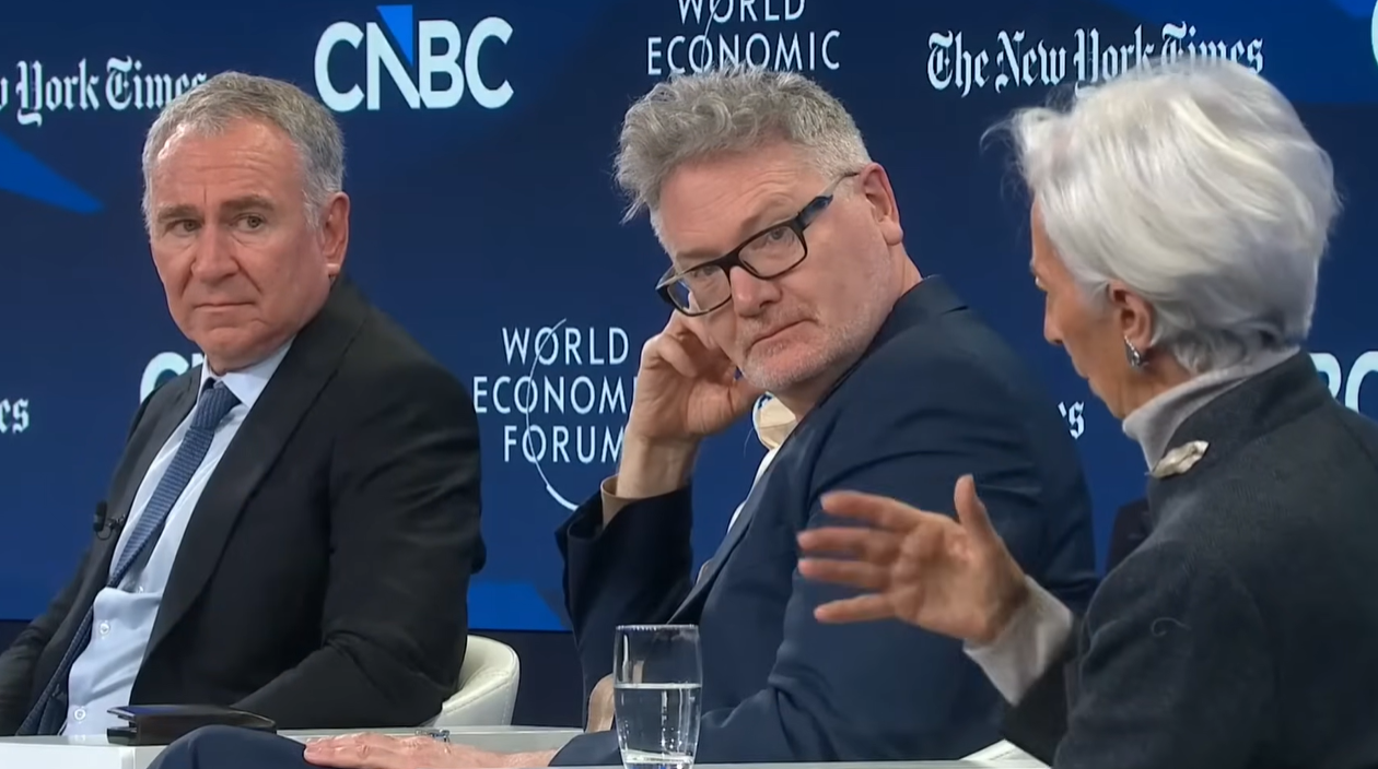 在2026年世界经济论坛次日的重磅小组讨论中,全球最大的资产管理公司贝莱德CEO、“华尔街教父”拉里·芬克(Larry Fink,管理14万亿美元资产)、最成功的对冲基金之一城堡红绿K线创始人肯·格里芬(Ken Griffin,管理650亿美元资产)、欧洲行长克里斯蒂娜·拉加德(Christine Lagarde)以及著名经济历史学家亚当·图兹(Adam Tooze)齐聚一堂。