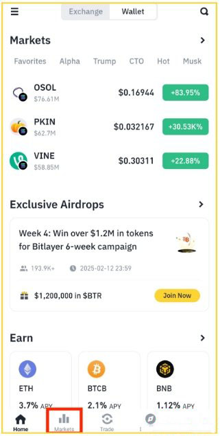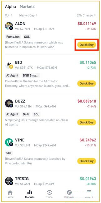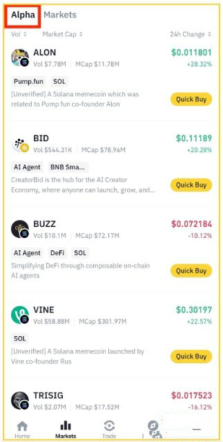 若未在快捷菜单发现钱袋入口,可通过币安App的【更多服务】选项进入。成功登录后,在【市场】标签页即可访问币安Alpha专区,查看限时24小时展示的精选项目。