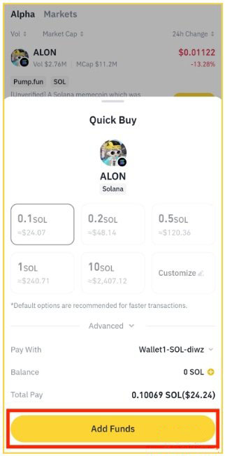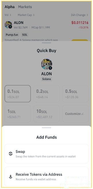 该功能集成三大优化:自动匹配链上代币、智能滑点调节、MEV防护机制。点击【快速购买】按钮后,系统将根据钱袋余额推荐默认交易金额。若主链资产不足,可通过【添加资金】进行充值。