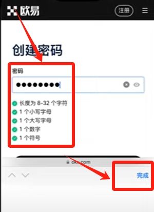 来到创建密码。这里要看清楚他的密码设置要求。没满足一个要求,前面就会打上绿色的小勾,点击“完成”。就完成了账户的创建。