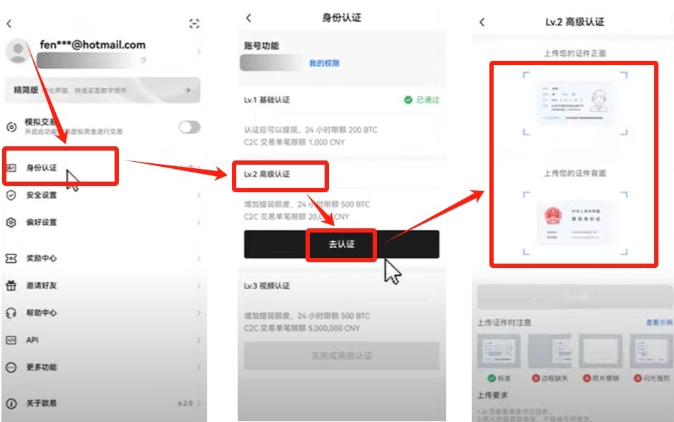 我们再进入刚才的身份认证页。L2高级认证可做可不做。他 与L1的差别在于额度的上线,他是需要上传身分证照片的。