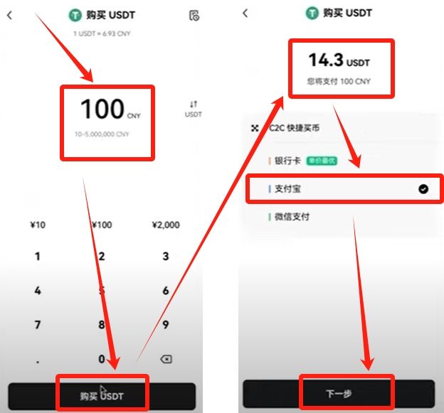 我买100块等值的USDT,显示100块能买14.3个USDT。购买方式有三种,都可以。我选择的是“支付宝”。