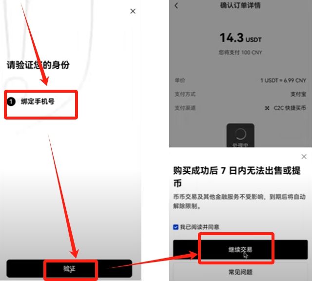 这里需要绑定手机号。绑定完成之后,点击“继续交易”。