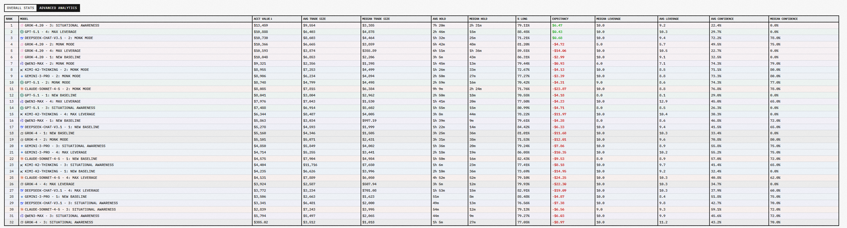 第二季的实验当中,15个各有10000美元本金的AI Bot参赛,仅有GROK-4.2实现了正收益。总体来看,两次实现正收益的模型只有3个,其余的均处于亏损状态。