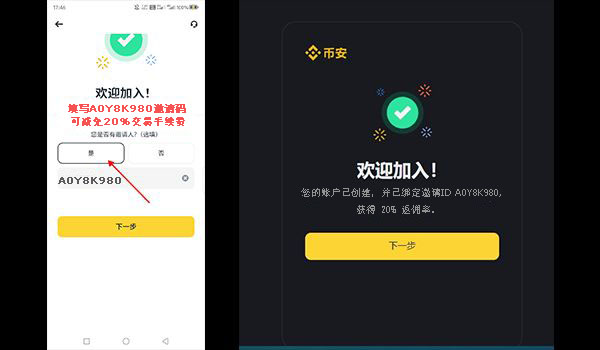 填写推荐码:此外,你还可以填写推荐码(例如A0Y8K980),这样你和推荐人都可以获得额外的奖励和20%的手续费返佣。
