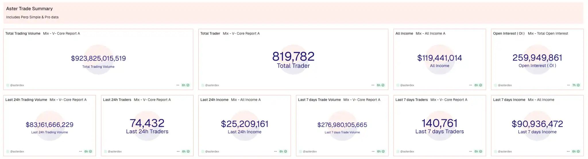 根据 Dune 上的最新数据,Aster 在多个关键指标上的增长表现相当亮眼。总锁仓价值(TVL)达到 14.67 亿美元,充分体现了项目的资金吸引力和市场认可度。更厉害的是累计交易量突破 9238 亿美元,这个数字不仅体现了平台的交易活跃程度,更反映出用户对平台的高度粘性和信任。用户规模方面,平台已经积累了 305.7 万总用户,为项目长期发展打下了坚实基础。协议累计收入 11.94 亿美元,有力证明了平台盈利模式的有效性。