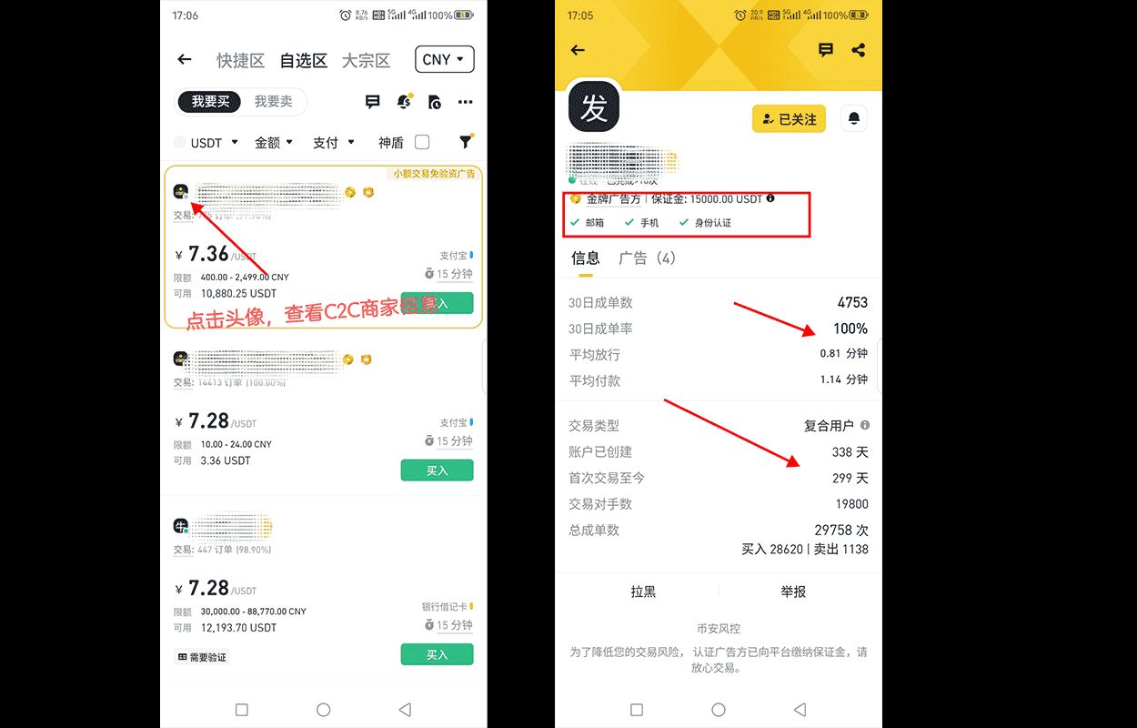 6.完成交易:交易完成后给予对方适当评价。如果对方是长期的C2C商家可以关注,后续如需出入金找同一商家即可。