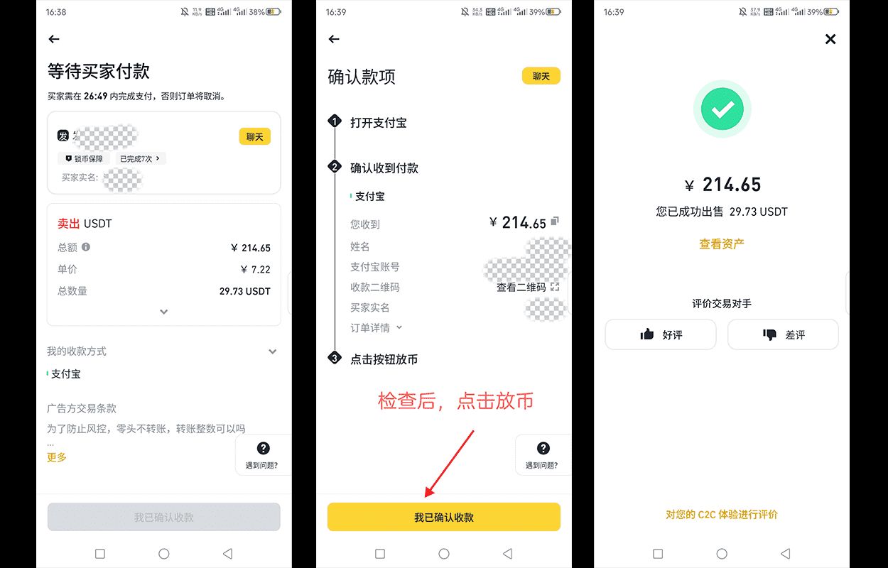 5.确认收款:检查自己的支付账户是否收到相同的出售金额,确认金额无误后点击"已收到付款",系统将释放加密货币给买家。