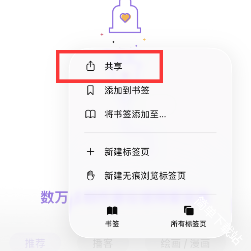 3、点击浏览器下方的三点并选择共享