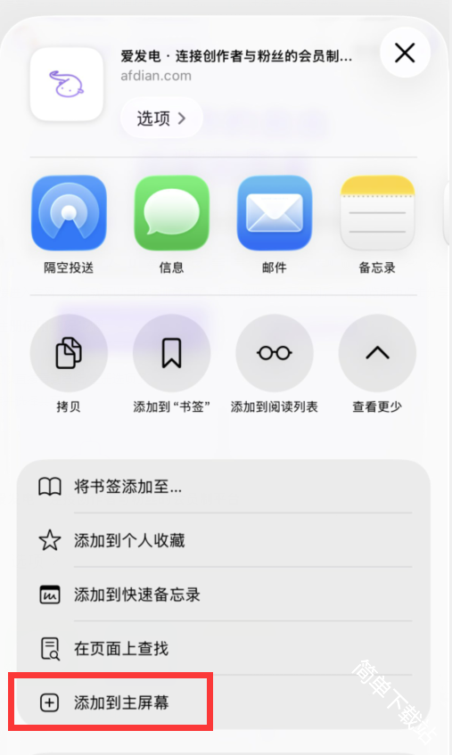 注册爱发电并使用可以直接进入官网,然后就可以直接注册登录了,使用浏览器打开官网后,在浏览器中点击分享图标,再点击添加到主屏幕选项,最后选择添加即可在主屏幕上看到了。