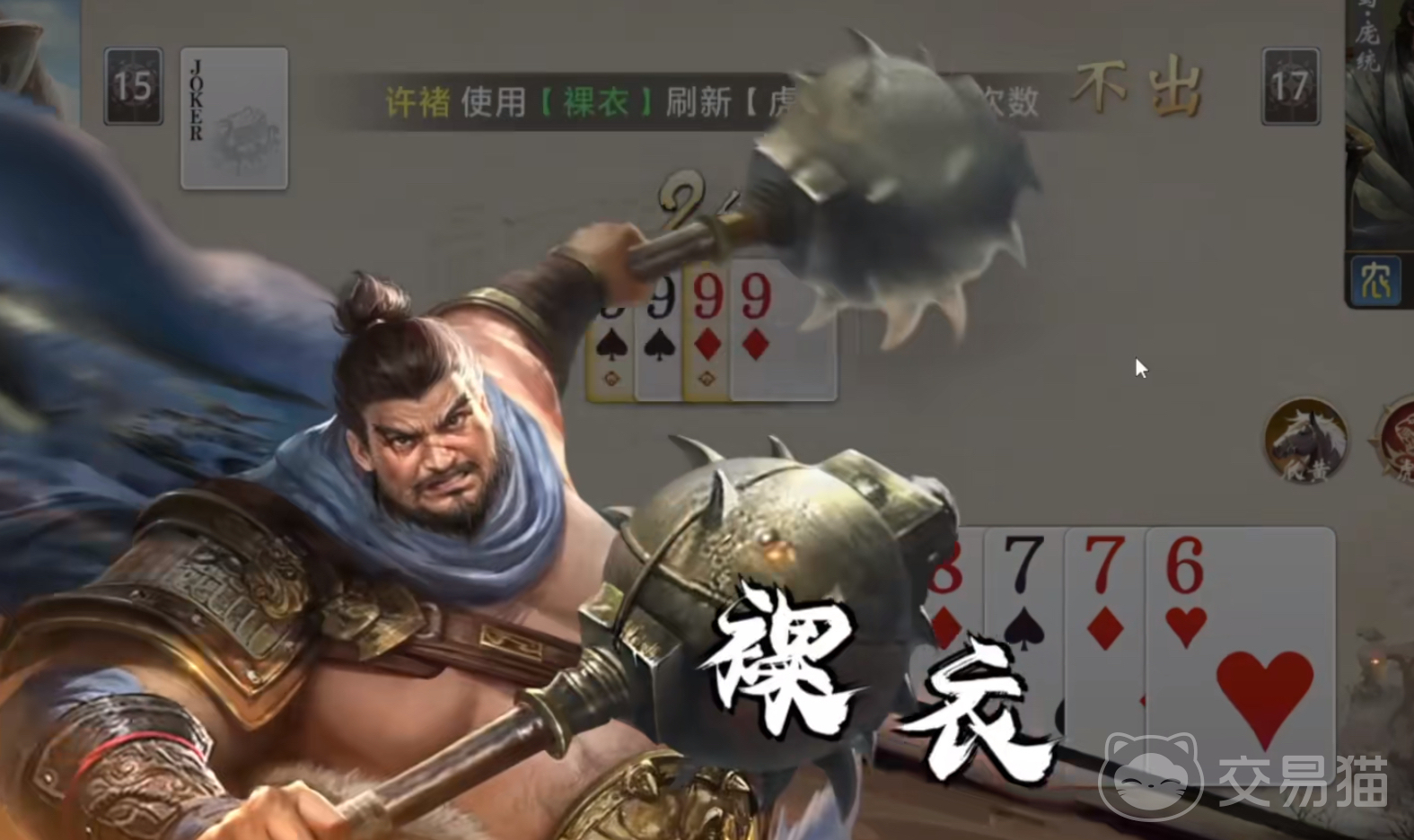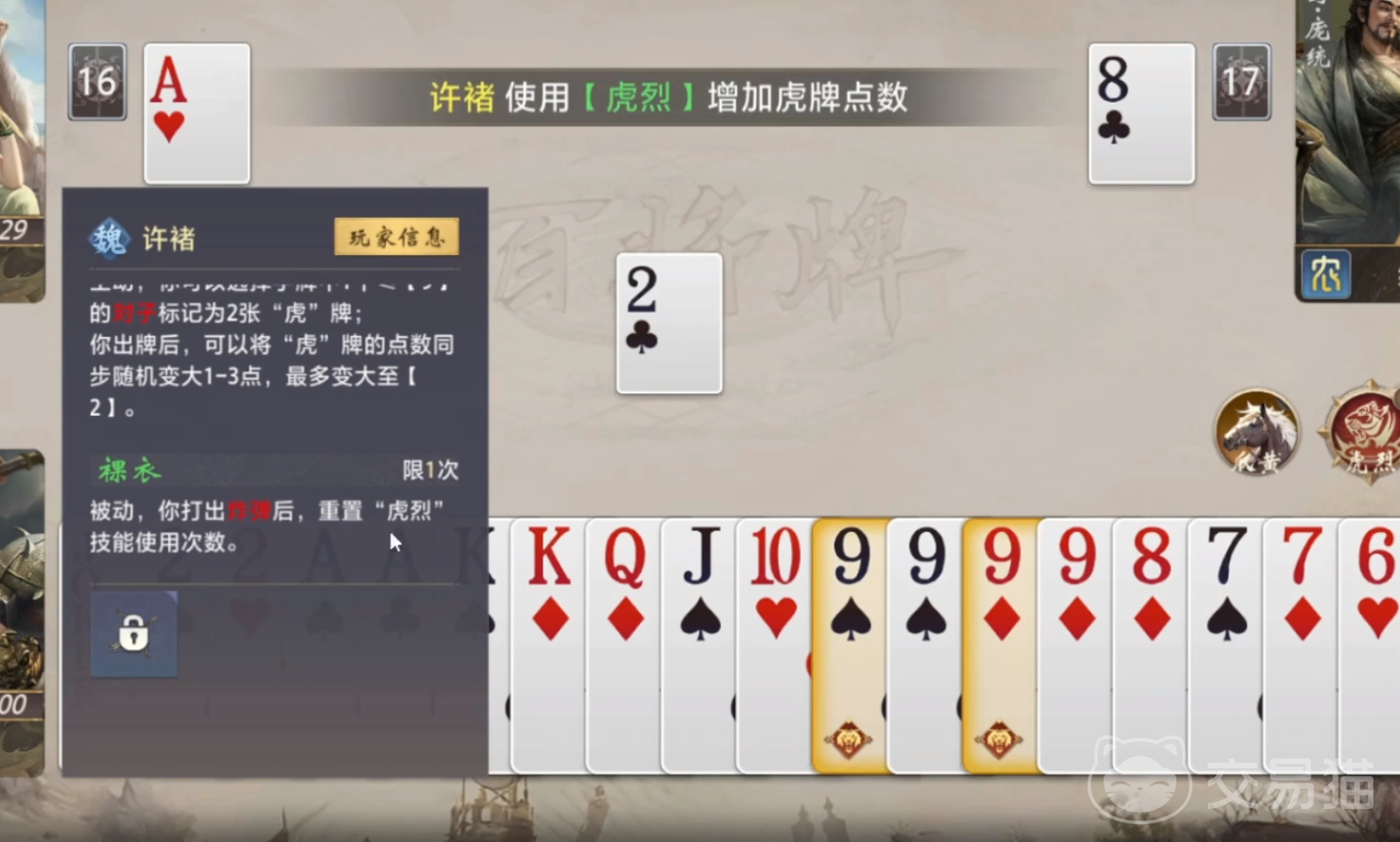 许褚定位为魏国核心输出武将,拥有两个相互协同的核心技能:【虎烈】与【裸衣】。其中【虎烈】为回合内主动技——在你的出牌阶段,可选定一张手牌中点数≤9的对子(如33、77),将其标记为【虎牌】;随后当你完成一次出牌动作后,该【虎牌】将自动触发一次点数跃迁,随机+1至+3点,但上限恒定为【2】(即最高变为22)。该机制本质是将低价值对子转化为高威胁组合,有效缓解手牌冗余压力,提升单回合出牌效率与压制力。