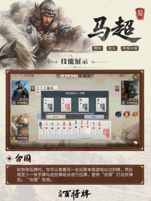 马超的强度呈现明显正向反馈特征:对手出牌越频繁,合围可调用的历史数据越丰富,组合成功率越高。开局阶段应避免过早消耗高权重牌型,推荐以单张、对子或小顺子试探,保留K、A级对子及三I张同点牌,待合围时机成熟后,直接组合出四张同点炸弹,瞬间逆转出牌权。此过程要求玩家具备基础记牌能力,尤其关注对手弃置的高点数牌张分布。