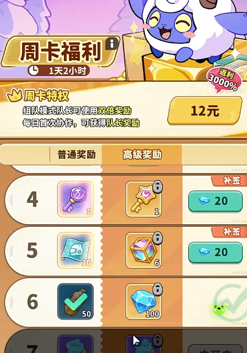 对于偏好短期灵活投入的用户,12元周卡是高性价比选择:购买后连续7天可通过每日签到领取钻石及其他实用道具。除基础资源外,周卡还赋予组队协作场景下的双倍收益加成;当玩家担任队伍发起人(队长)时,可额外获得队长专属奖励,进一步强化社交玩法中的投入回报率。
