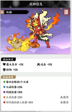 1、自成体系:祝融是火系玩法的绝对核心。他的存在让你可以无脑选择火系神通(技能),每拿到一个火系技能,你的伤害都会成倍增长。