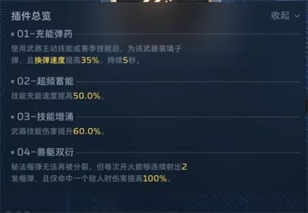 这套插件榴弹差不多5秒一个,天赋带行境幻化,开技能可以增加100%回能,差不多相当于4发榴弹,打boss直接右键榴弹砸就行,手枪插件随便带的
