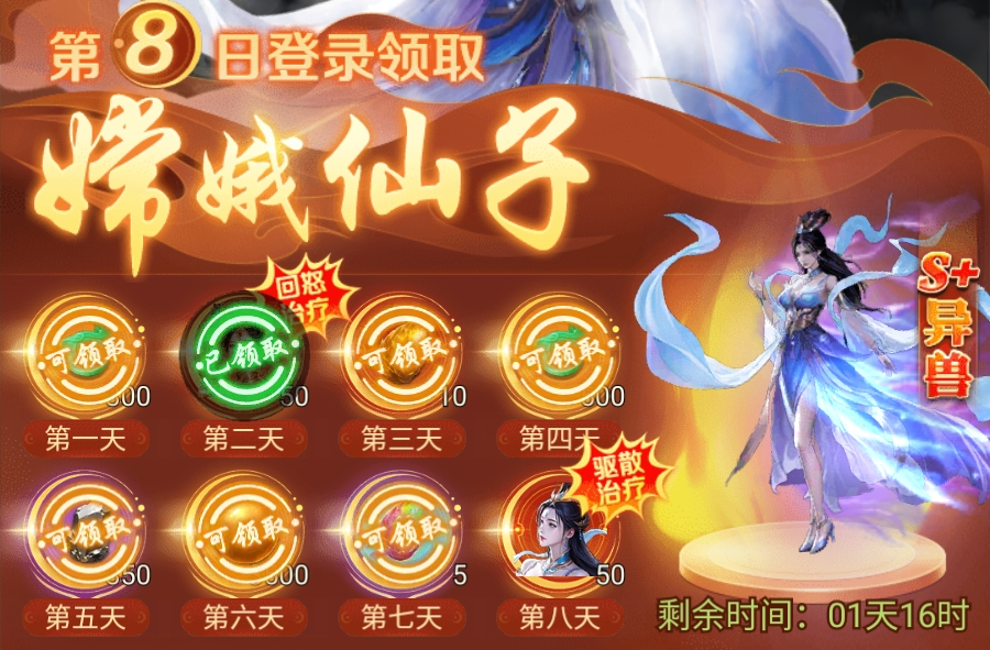 连续签到可逐日领取丰厚奖励,次日即得强力异兽【金乌】,第八日终极大奖为【嫦娥】,二者均为中前期泛用性强、适配度高的核心角色。