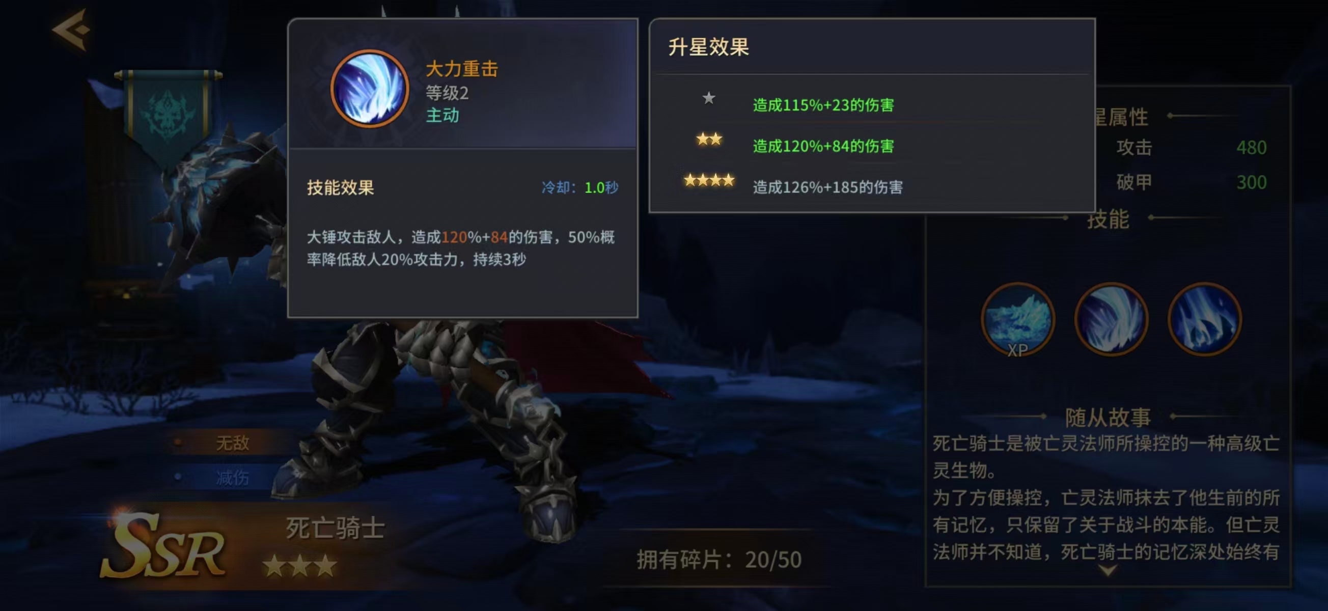 角色图鉴与养成资料可在九游专区免费查阅,内容涵盖技能升级路径、星级突破材料、阵容搭配建议等完整信息。九游平台提供高性价比会员服务:1元开通白银会员后,每月可领取50元游戏代金券,全年累计达600元;若叠加开通省钱卡,每月代金券提升至60元,年度总额为720元。在战斗定位上,死亡骑士承担团队前排承伤与敌方压制双重职能。其一技能“大力重击”以巨型战锤发动范围打击,基础伤害随星级提升而增强,同时稳定触发50%概率的攻击力削弱效果,降低目标20%攻击力,持续3秒,该减益效果不随星级成长而变化。