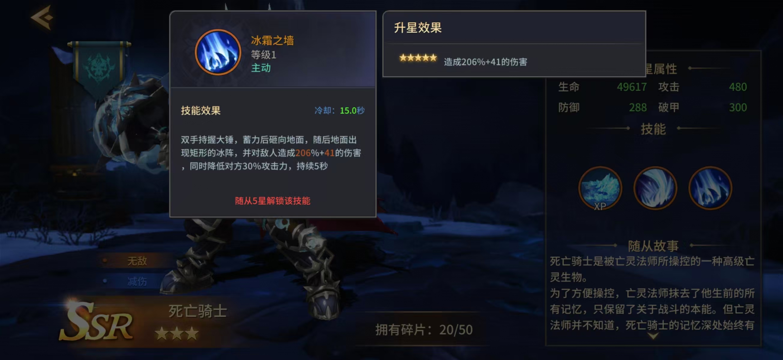 二技能“冰霜之墙”为蓄力型控制技,落地后生成矩形冰霜区域,对范围内所有敌人造成伤害,并施加30%攻击力削减,持续5秒。终极技能“亡魂领域”开启后,不仅对区域内敌人造成高额伤害,还可为主角提供两项关键增益:一是提升20%随从技能减伤效果,二是赋予主角3秒无敌状态。