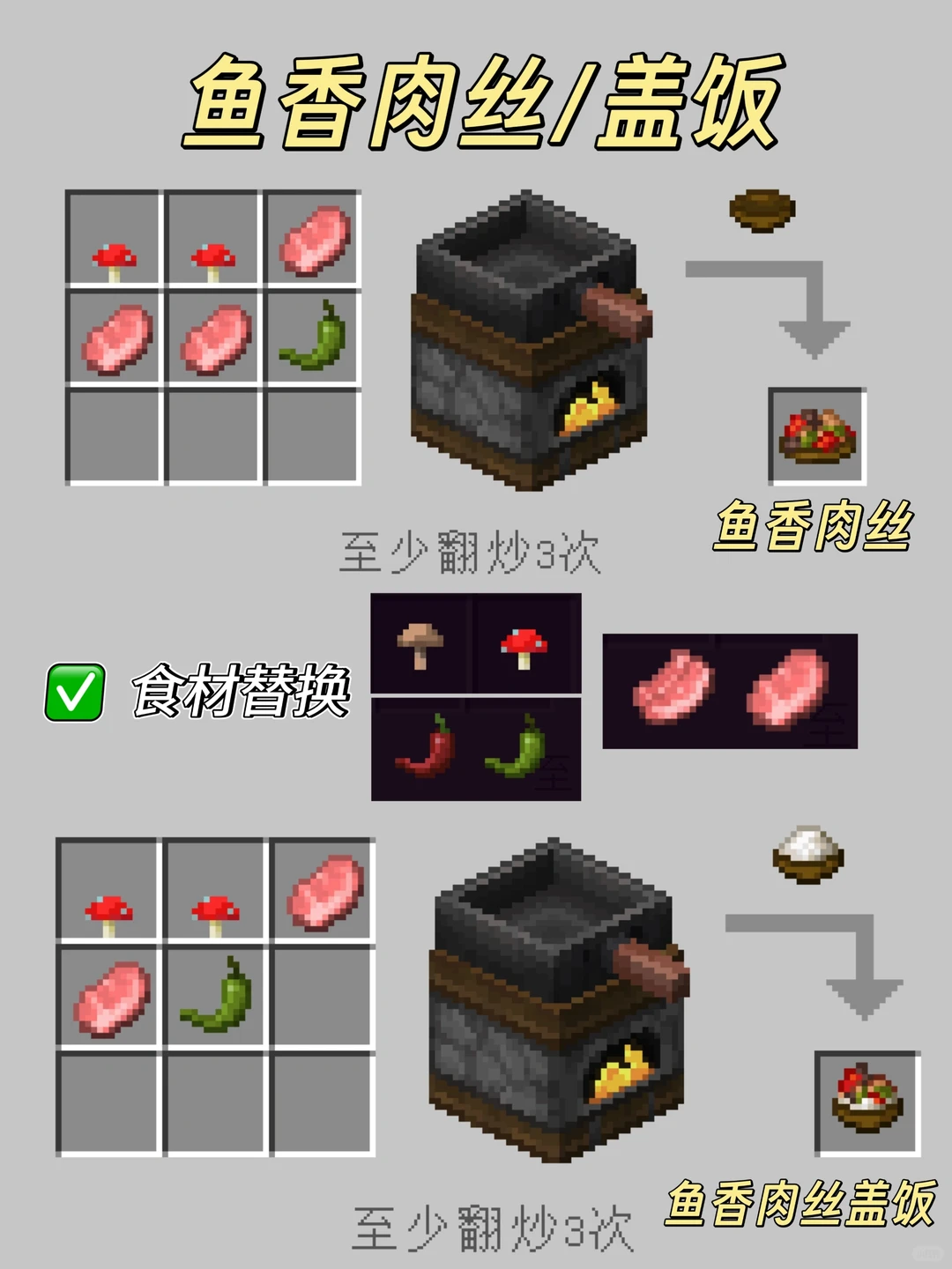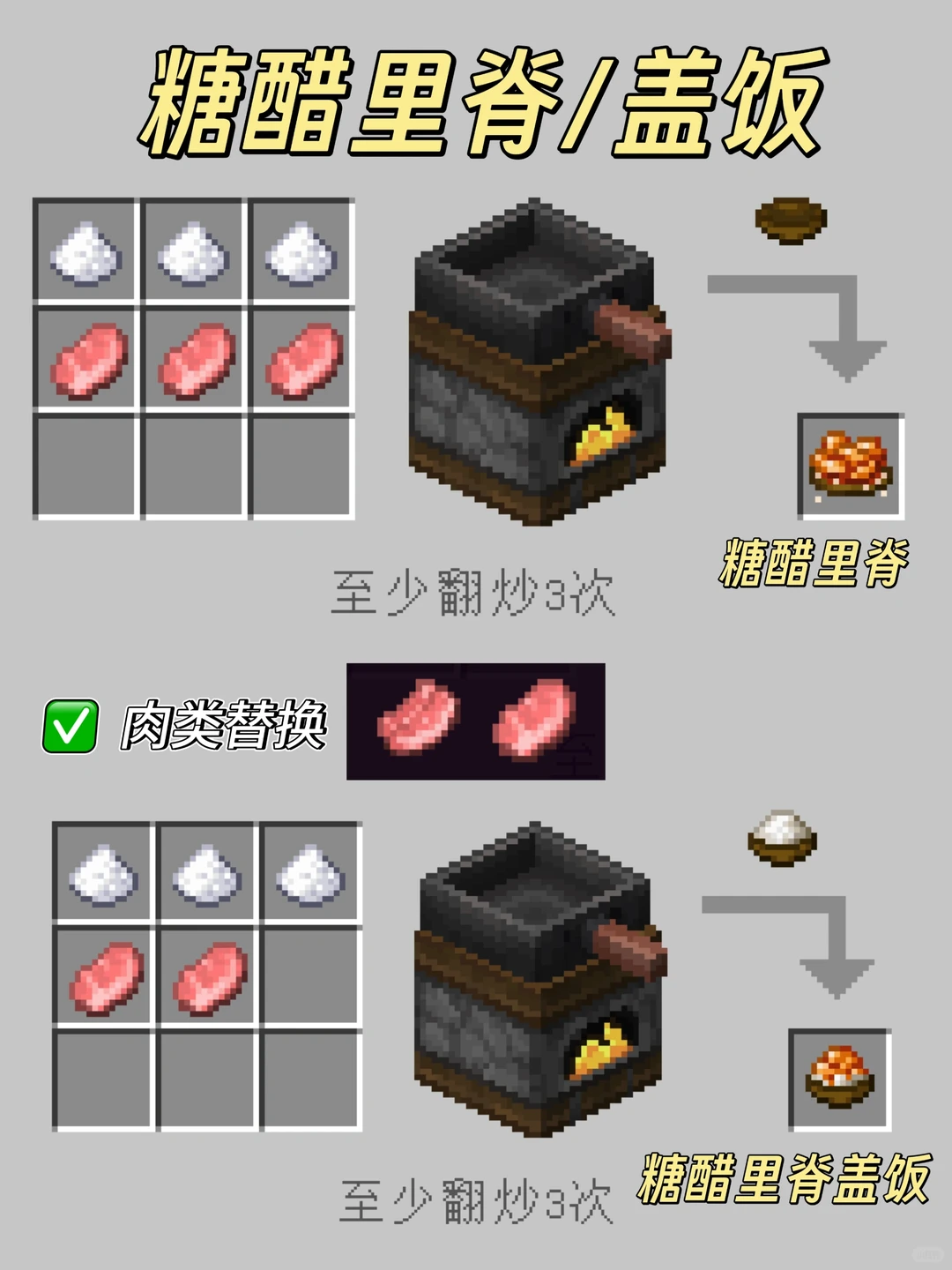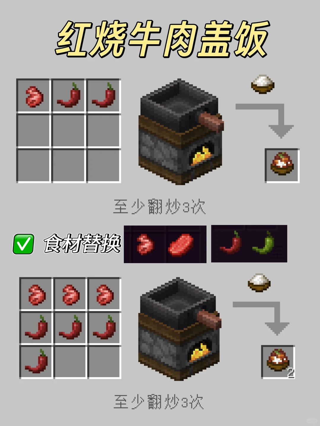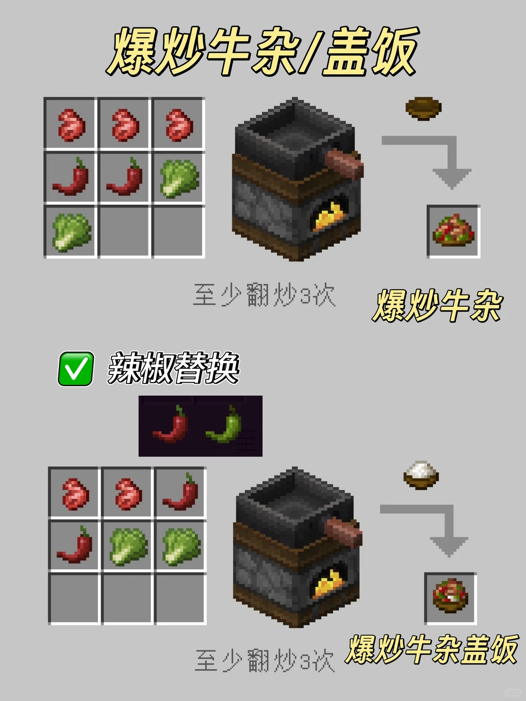 我的世界森罗物语中在厨房中能够简单制作的料理食物有多种,部分食物还需要进行各种处理后才可进行合成制作,在厨房中还可以制作各种炒菜盖饭类的花样食谱,例如番茄炒蛋、爆炒牛杂、红烧牛肉、红烧牛肉盖饭、田园杂蔬、青椒炒肉、糖醋里脊、鱼香肉丝、红烧鱼盖饭、辣子鸡盖饭,对应的制作方法配方内容见以下正文!