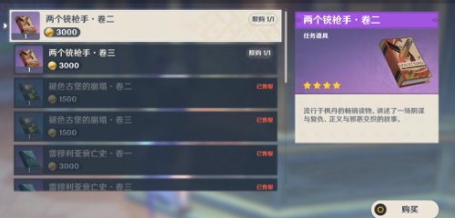 3、与商贩于贝尔对话,选择购买书籍,花费摩拉进行购买获得第二卷和第三卷。