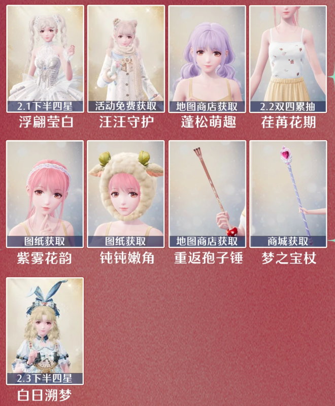 浮翩莹白、汪汪守护、蓬松萌趣、荏苒花期、紫雾花韵、钝钝嫩角、重返孢子锤、梦之宝杖、白日溯梦