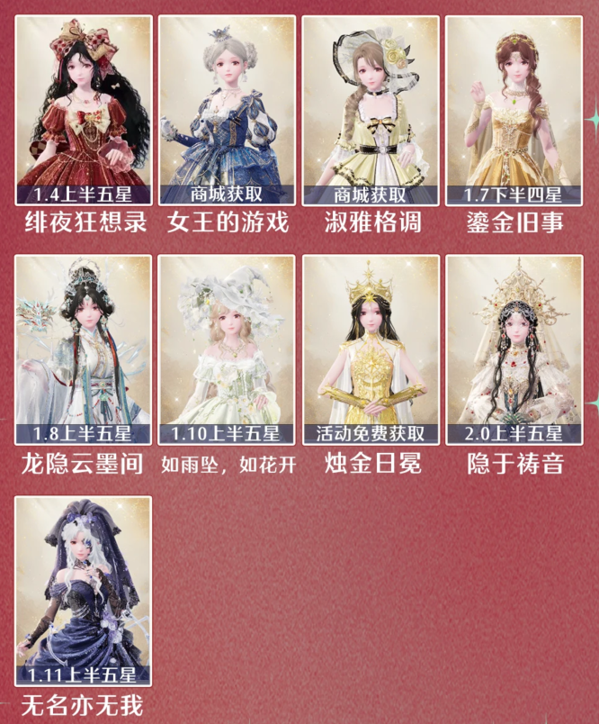 绯夜狂想录、女王的游戏、淑雅格调、鎏金旧事、龙隐云墨间、如雨坠如花开、烛金日冕、隐于祷音、无名亦无我