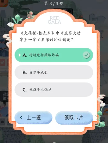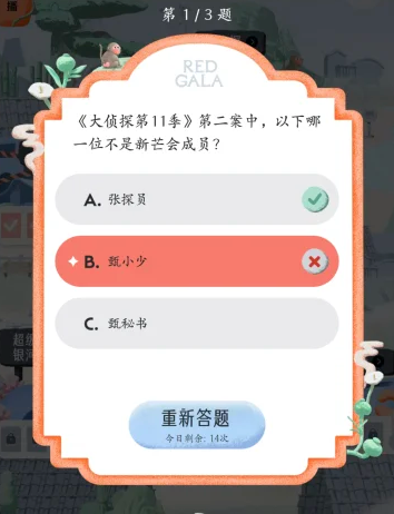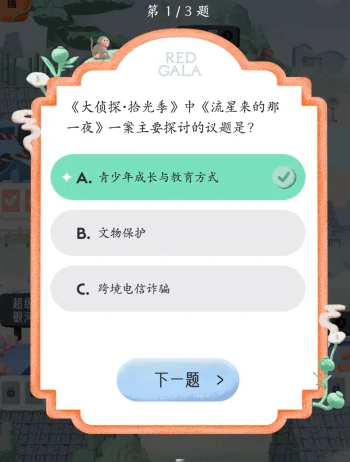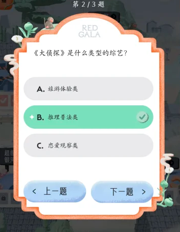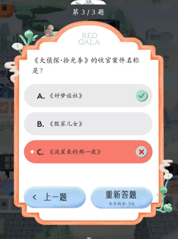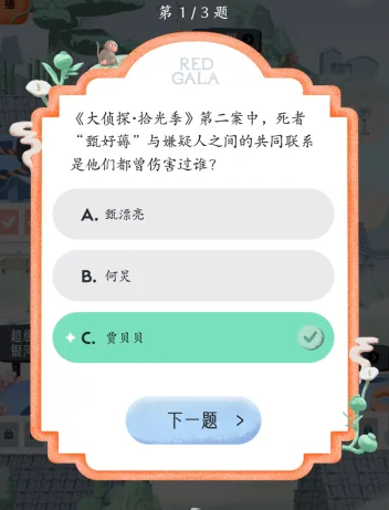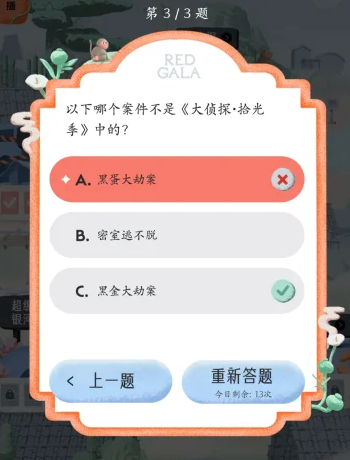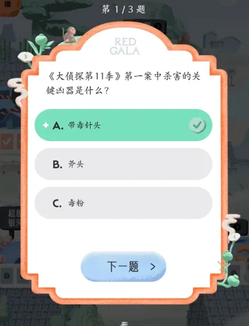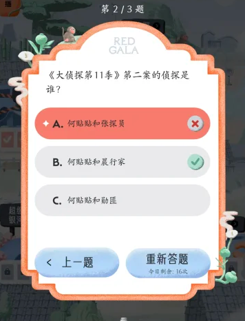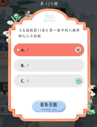 REDGALA中可以参与大侦探的答题活动,需要回答出在大侦探拾光季与大侦探第11季中的各个题目的答案,下文为大家列举出这些大侦探答题中的题目以及对应的正确答案内容!