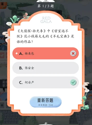 11、《大侦探·拾光季》中《密室逃不脱》花小钱薅大毛的《羊毛爆点》是谁的作品?何房产