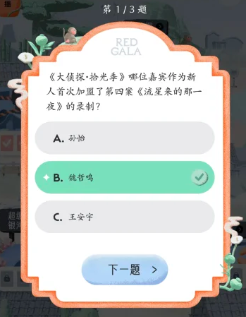 13、《大侦探·拾光季》哪位嘉宾作为新人首次加盟了第四案《流星来的那一夜》的录制?魏哲鸣