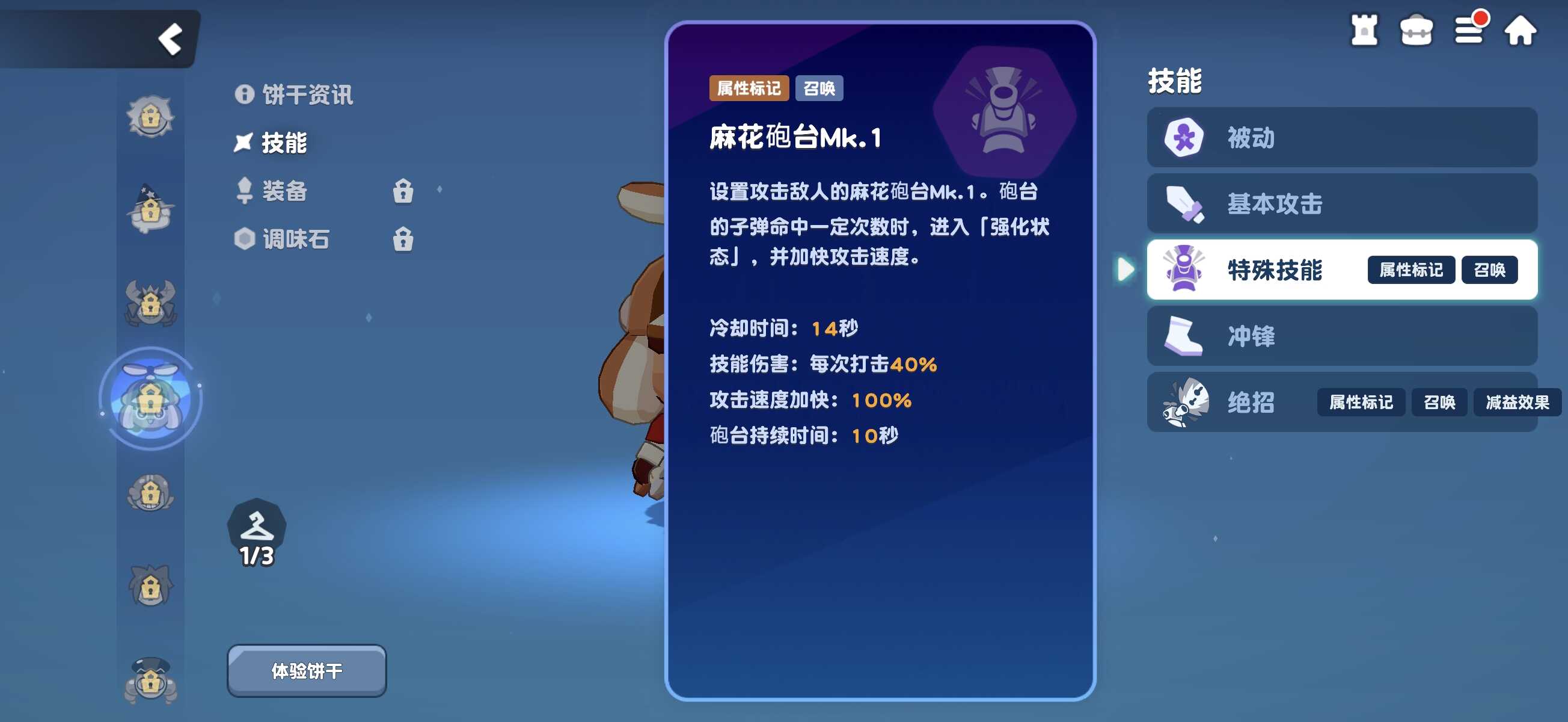 技能体系方面,麻花卷饼干采用“双炮台协同压制”策略。被动效果明确限定于特殊技能——麻花炮台MK1:每当巨大扳手命中目标,即可缩短MK1冷却时间1秒。普攻为三段式扳手投掷,具备基础连击节奏。特殊技能MK1可部署一座持续10秒的自动攻击炮台,命中目标达指定次数后触发强化状态,提升攻速;基础冷却为14秒,叠加被动后可实现近乎无缝覆盖。绝招则召唤MK2炮台,持续12秒,每次命中降低敌方1%土属性抗性,最高叠加10层;该技能冷却时间为32秒,且强化机制同样基于命中次数触发,但不享受被动减CD加成——需注意,MK1与MK2属于独立技能体系,机制互不关联。