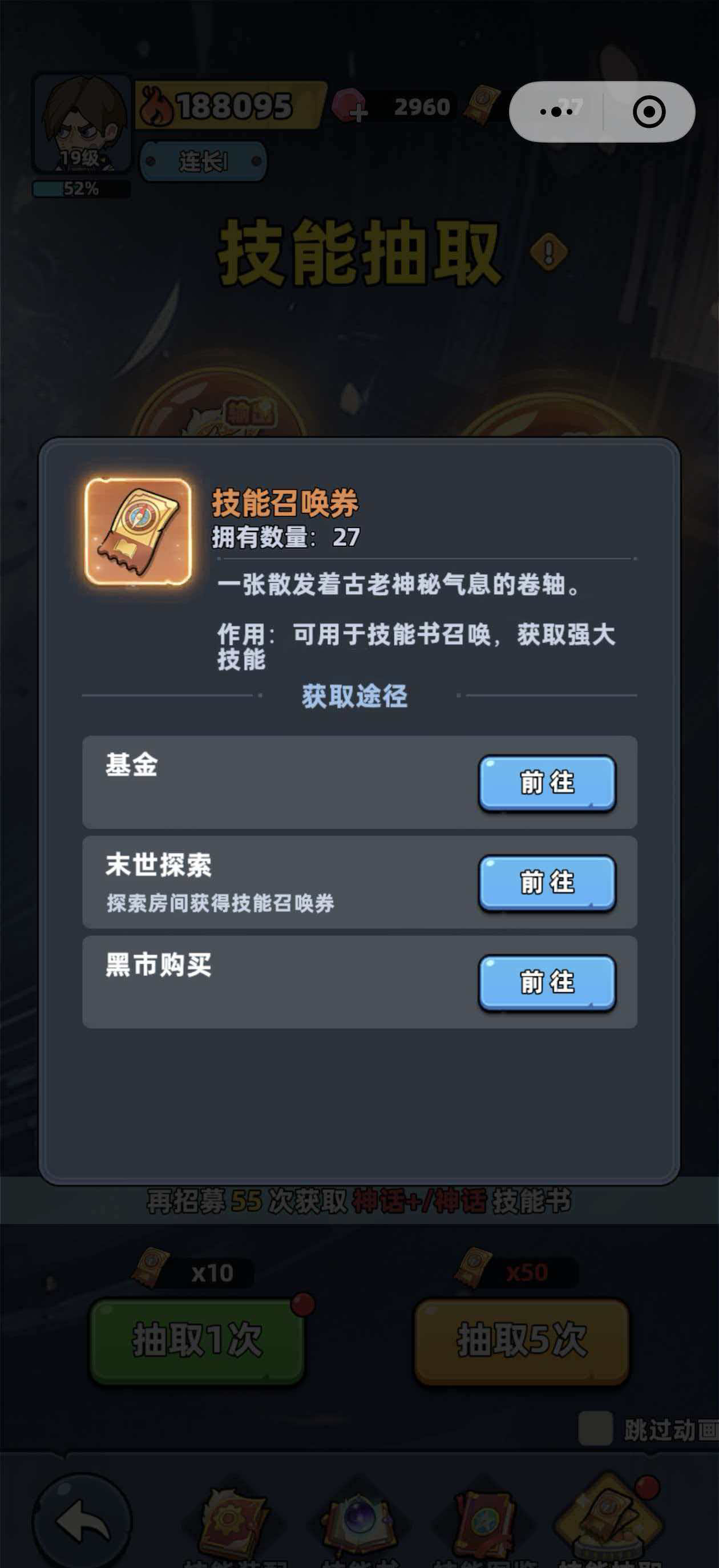 技能书并非随等级自动解锁,需通过特定途径获取。当前游戏内主要开放三类稳定渠道:召唤券抽取、场景探索拾取、副本掉落。其中,技能召唤券为限定道具,仅可通过技能书基金、末世探索及黑市兑换三种方式获得。技能书基金与末世探索属于日常可持续资源来源,投入成本低、产出稳定;黑市则作为阶段性补缺手段,适合急需特定技能书时使用。