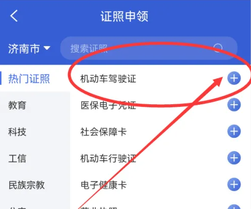 在证照申领页面,点击需要申请证照后的【+】即可申领成功。