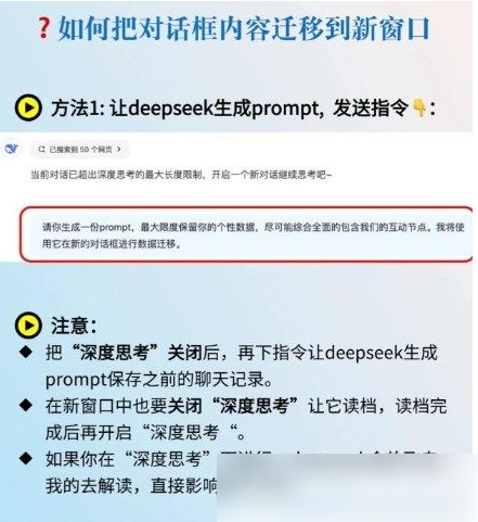 注意: 把“深度思考”关闭后,再下指令让deepseek生成prompt保存之前的聊天记录。 在新窗口中也要关闭“深度思考“让它读档,读档完成后再开启“深度思考“。 如果你在“深度思考”下进行,deepseek会放飞自我的去解读,直接影响迁移结果。