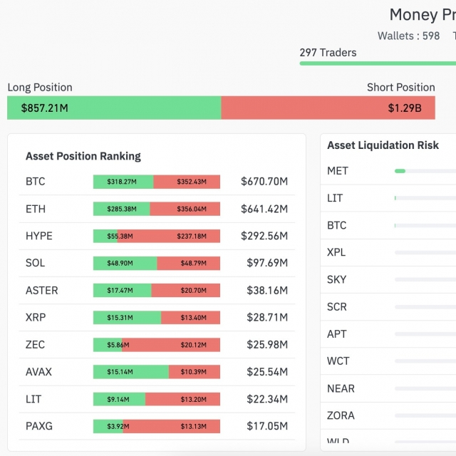 这598个钱包的整体风险敞口在加密货币市场仍以空头为主,空头头寸总规模达12.9亿美元,而多头头寸为8.57亿美元。与此同时,这些投资者对XRP保持着净多头敞口,其中多头总额为1531万美元,空头为1340万美元。